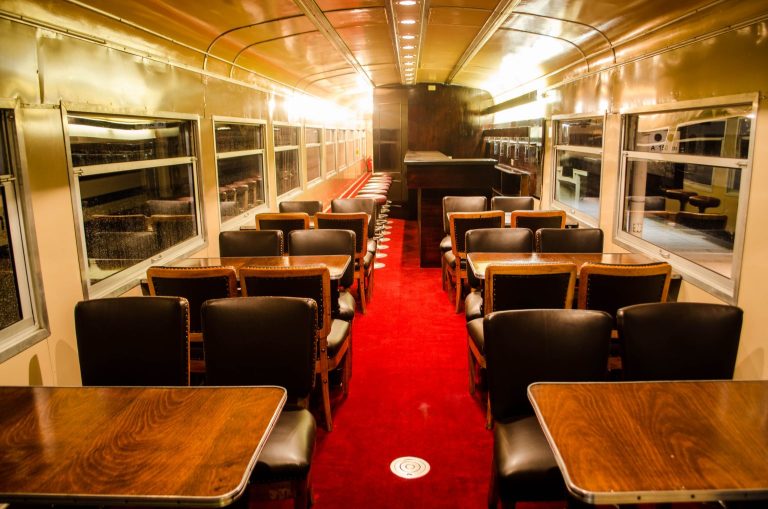 Este coche, de alrededor de 1929, está dotado de un interior enchapado en madera y, con su entorno social en sus mesas, permite generar un espacio para conversar y disfrutar el viaje, además de poder pasar el rato con juegos de mesa u otras actividades.